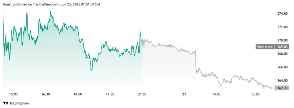 The stock of MicroStrategy and Bitcoin have both declined in response to the recent acquisition announcement. According to TradingView data, the MSTR stock price is currently trading at approximately $363, a decrease of roughly 2% in premarket trading.