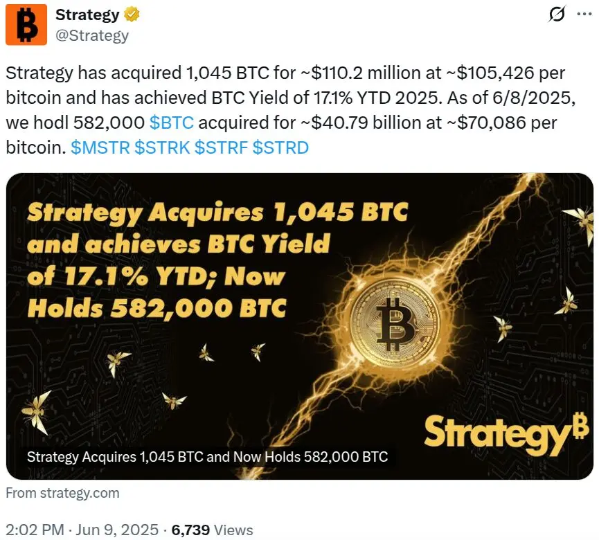 Strategy has added 1,045 Bitcoin worth $110.2M, raising its total BTC holdings to 582,000 as it continues its long-term accumulation plan.