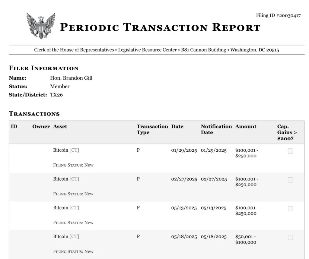 Gill disclosed two more recent Bitcoin purchases, each submitted promptly and totaling up to $250,000 and $100,000, respectively.