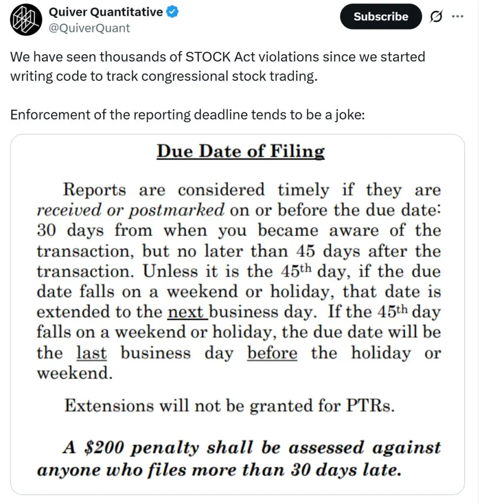 Interestingly, late STOCK Act filings usually only result in a $200 punishment. Investment analysis firm Quiver Quantitative described the punishment as a “joke” in a post on X on June 2.