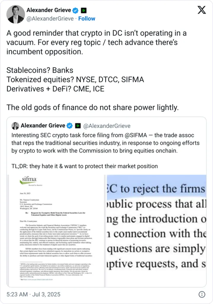 SIFMA members “want to protect their market position,” according to a letter written to X on Wednesday by Alexander Grieve, the vice president of government affairs at venture capital company Paradigm, as many more platforms may provide trading on tokenized securities that are essentially stocks.