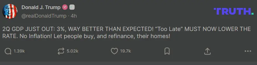 The most recent Q2 GDP figures exceeded the anticipated 2.3% estimate, as data from the US Bureau of Economic Analysis (BEA) indicated. In conjunction with declining inflation metrics, Trump implored Fed Chair Jerome Powell to lower rates, branding him “Too Late” for failing to do so after several Fed meetings in 2025.