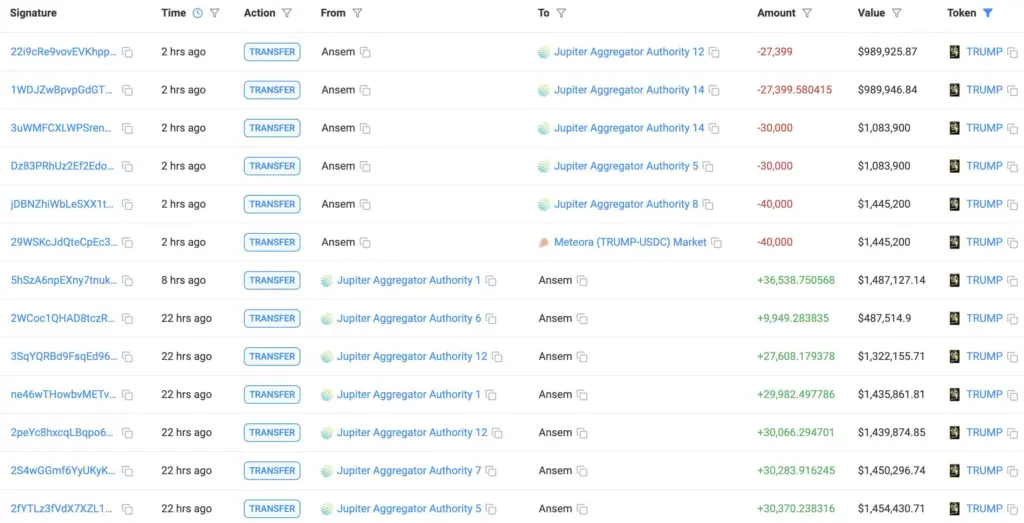 A total of two transactions have been identified, which were either sales or transfers of TRUMP tokens. They occurred immediately following the US Presidential Inauguration, during which Donald Trump took his second oath of office, and are collectively valued at $74.22 million. The initial transaction, as reported by Lookonchain in an X post, indicated that a wallet named Ansem sold 194,799 TRUMP tokens valued at approximately $6.83 million.