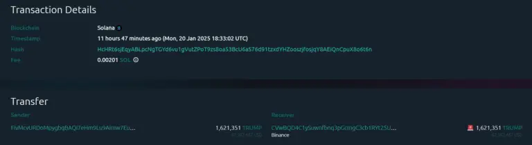Another transaction, as reported by Whale Alert, demonstrated that an unknown wallet transferred 1,621,351 TRUMP meme coins, which were valued at nearly $67,392,467, to another unknown wallet. This has prompted speculation that additional sell-offs may be imminent as the TRUMP token’s value continues to plummet precipitously.