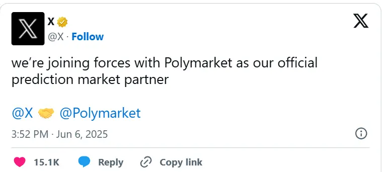 On June 6, 2025, X, which is owned by tech magnate and Tesla CEO Elon Musk, announced its partnership with Polymarket. The company announced the collaboration through its platform account.