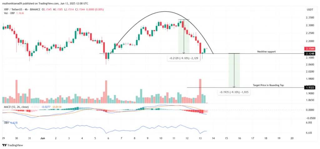 The four-hour XRP price chart has developed a rounding top pattern, a standard indicator that a trend is on the brink of an adverse shift.
