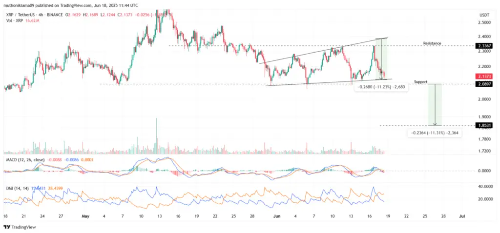 The XRP price is on the brink of another collapse following the emergence of a rising wedge pattern on the four-hour chart, which suggests that the short-term momentum is about to shift toward bearishness.