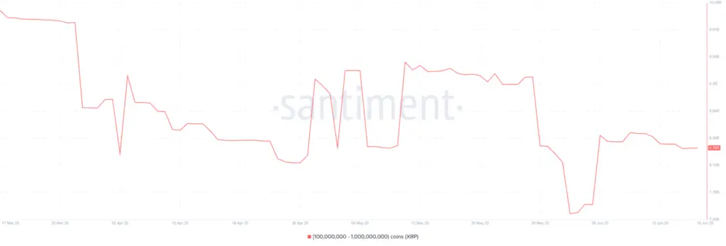 The whale addresses, who hold between 100 million and one billion XRP tokens, have decreased their holdings by 200 million.
