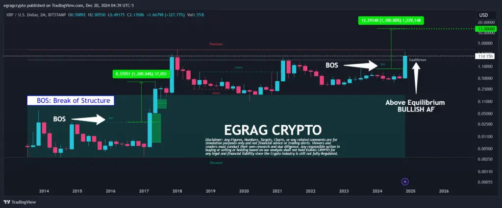 Egrag Crypto, a seasoned analyst, has identified bullish prospects for XRP through technical analysis. The 12-month timeframe identifies XRP’s yearly close above $1.99 as critical, representing the highest closing level since 2017. The asset’s value may experience sustained growth due to this milestone.